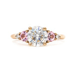Our Rosalind ring is an ethereal five stone engagement ring with an alluring elongated taper and perfectly placed prongs. Moving outward from the middle, each stone is half the size of the stone it's next to. We can easily change the stones or add an accent color in this ring to make it unique and perfect for you.