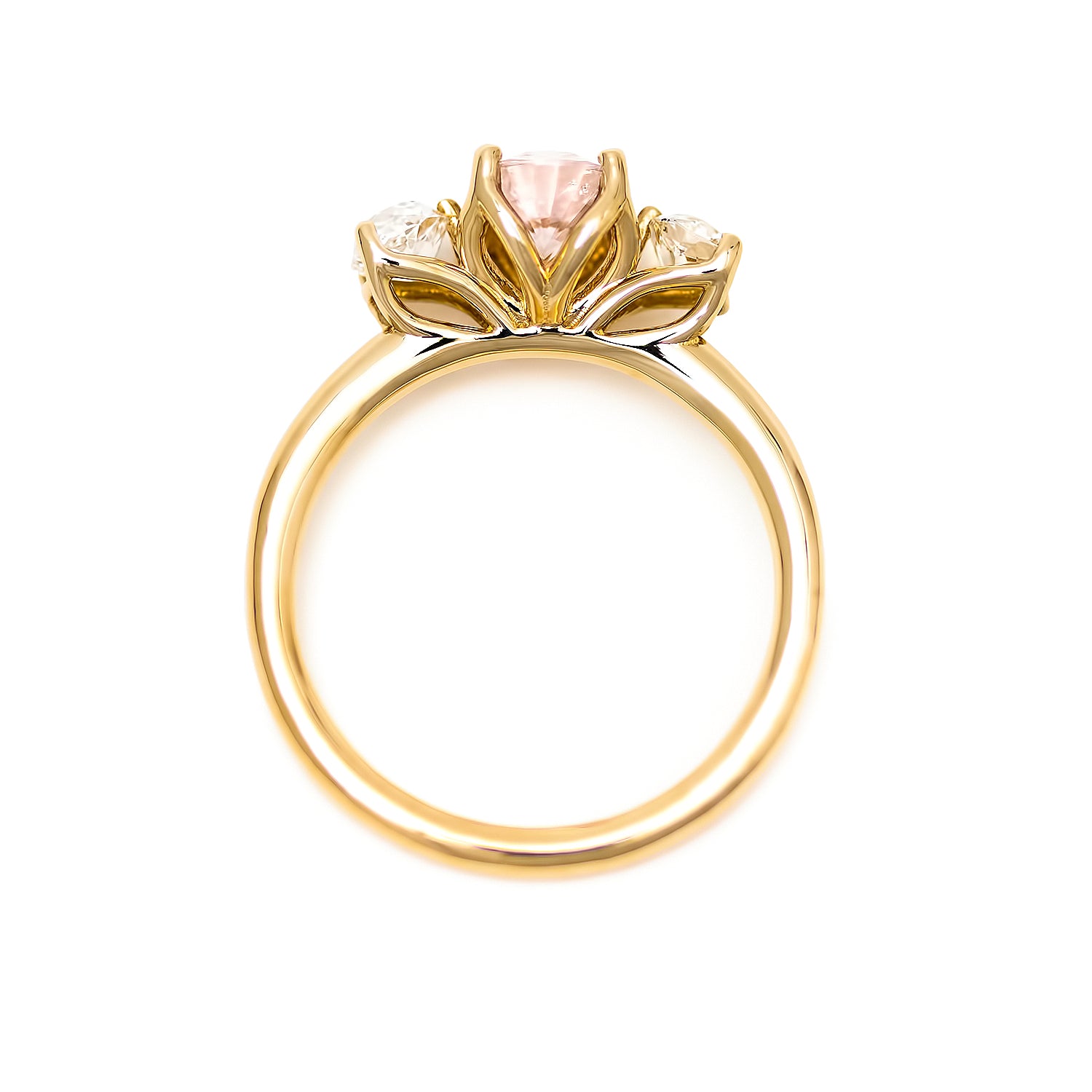 The Zita ring is a vintage inspired pink sapphire & diamond engagement ring is as romantic as it is stunning! It has an incredibly delicate 4 tulip prong setting on the pink sapphire and 3 prong tulips on the diamonds. The prongs taper inward to draw attention to the main stone. The side profile of this ring is really pretty! The tulip prongs show mostly from the side.